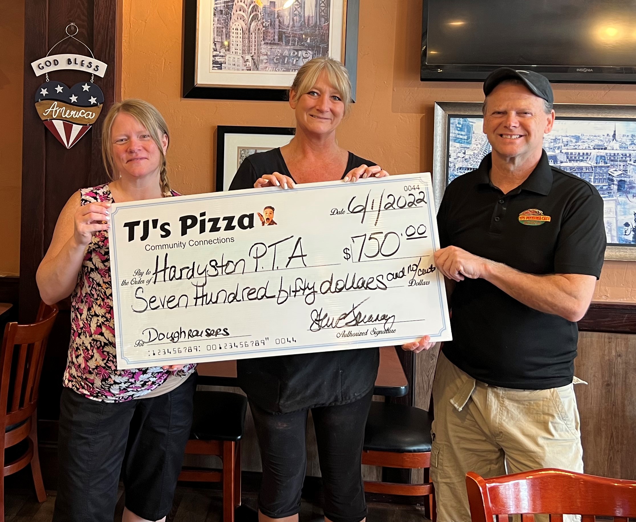 Published: Jun 29, 2022 Share: Last modified: Jun 29, 2022 Location: Franklin, NJ 07416 Target Area: County TJs Pizza is proud to support and donate $750.00 to the Hardyston PTA. The proceeds are from a successful Dough Raiser. Thank you all for your support.
